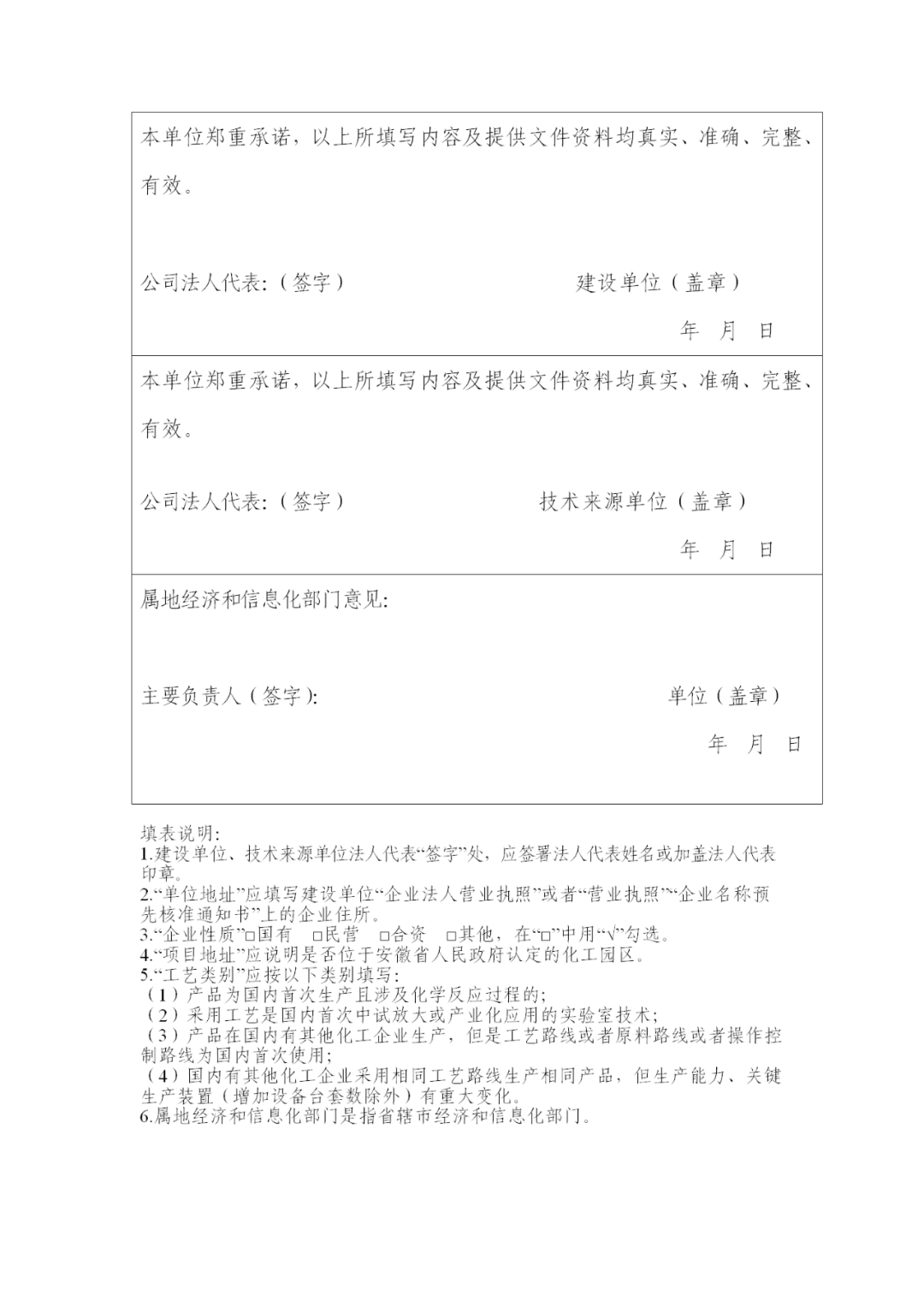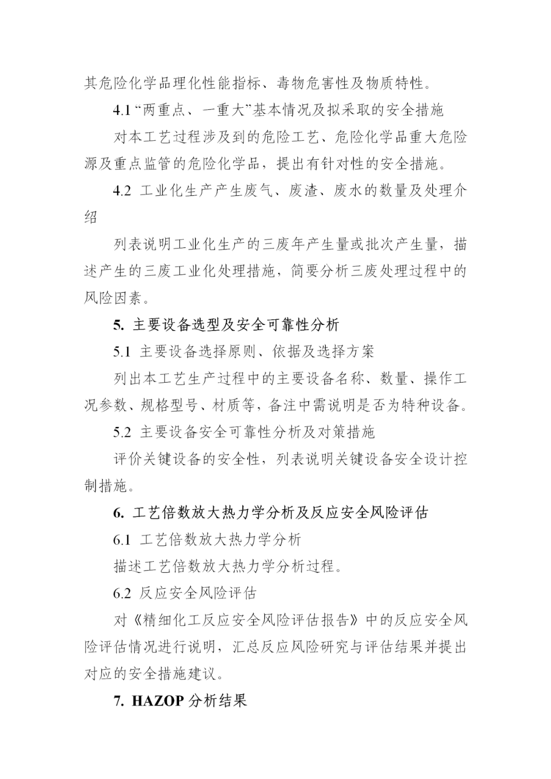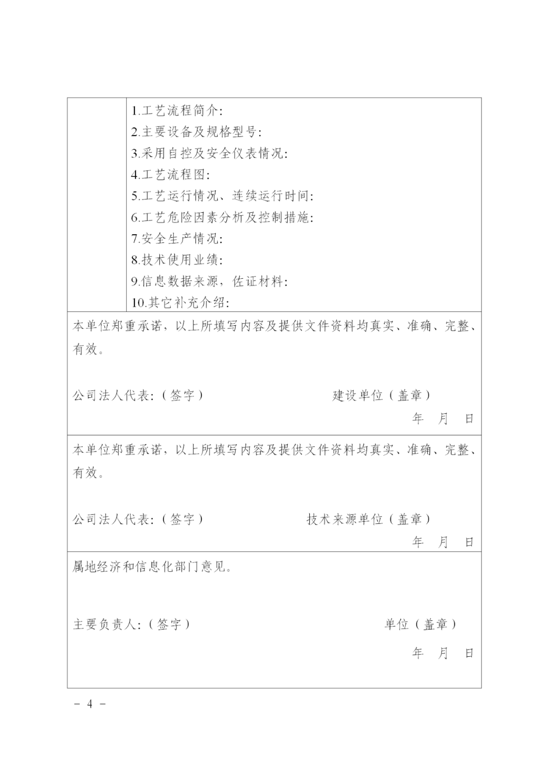 第四条 建设单位拟采用的化工工艺符合本办法第三条第1、2、3、5项情形之一的,应当提交“安徽省国内首次使用化工工艺安全可靠性论证申请书”(见附件1)、“安徽省国内首次使用化工工艺安全可靠性论证报告”(以下简称论证报告,见附件2),国家一级科技查新咨询机构出具的查新报告或工艺、技术、产品等方面的专利、标准及其它相关材料。