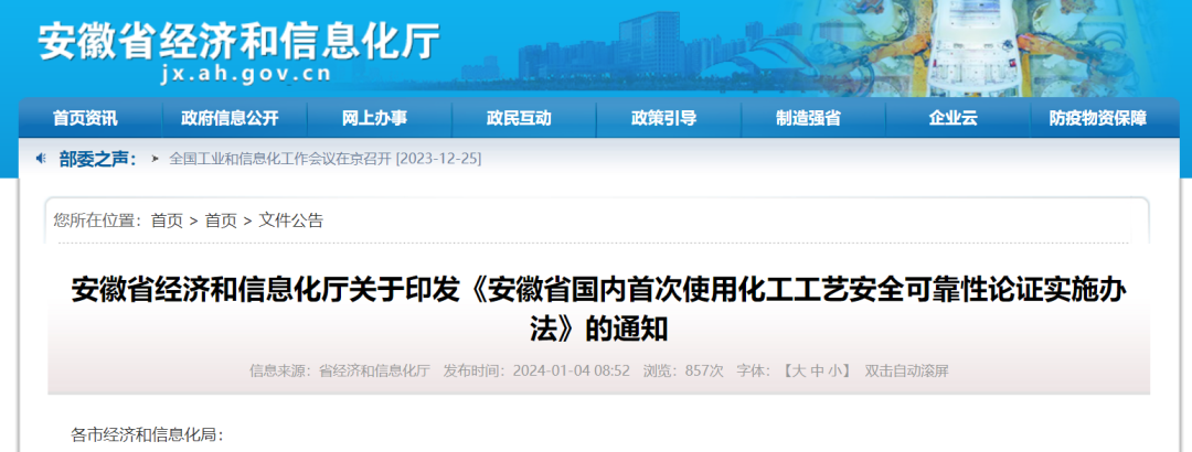 近日,安徽省经济和信息化厅印发《安徽省国内首次使用化工工艺安全可靠性论证实施办法》。