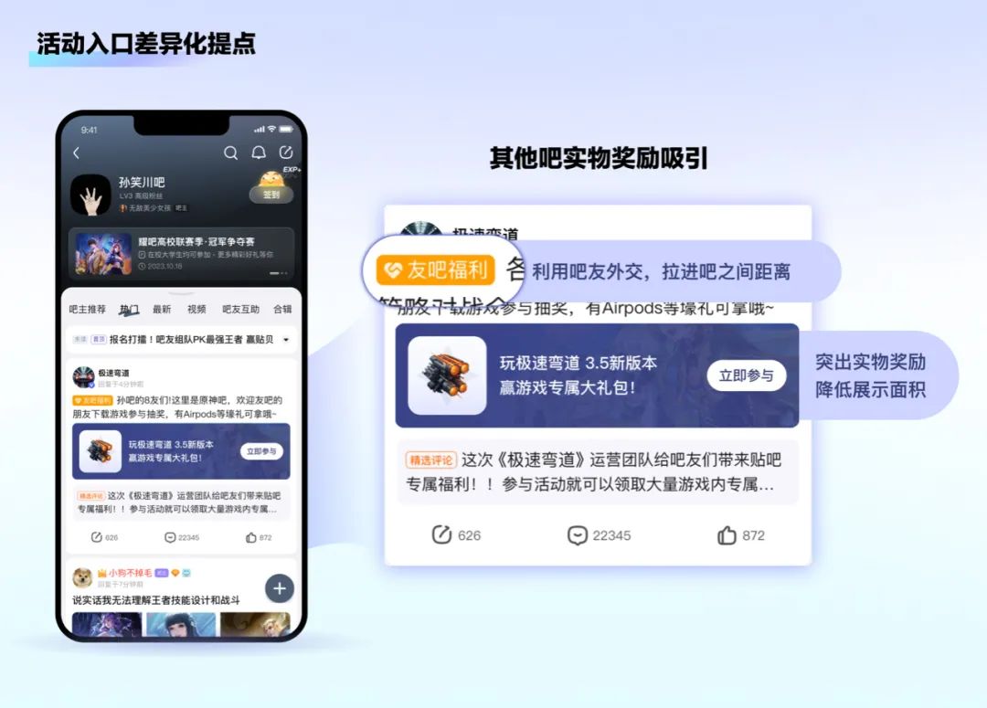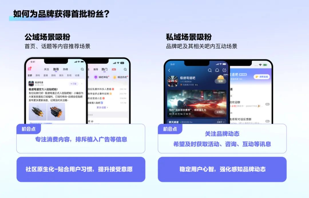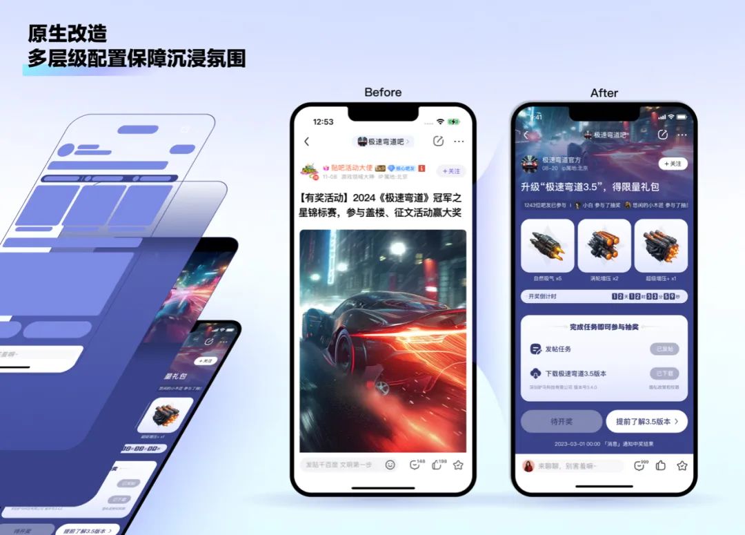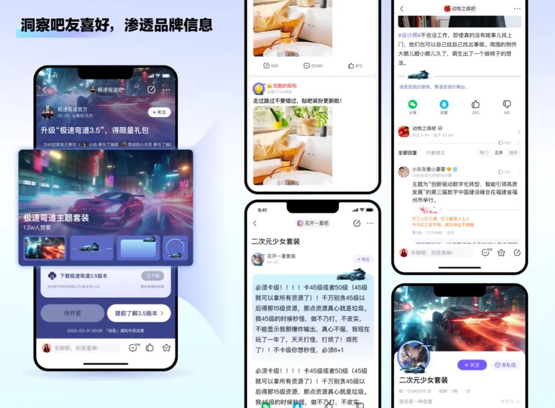 贴吧首页等公域场景用户注重新鲜事等内容浏览,为了贴合用户消费内容的习惯,我们改进原有的资源位,采用“社区原生化”的设计策略,收获了大批用户转化及正向评论。相比原有的大面积广告位宣传,多图互动形式让用户像看社区内容一样获取品牌信息,从而降低对广告的反感,避免过强的广告样式让品牌错失粉丝转化的可能性。
