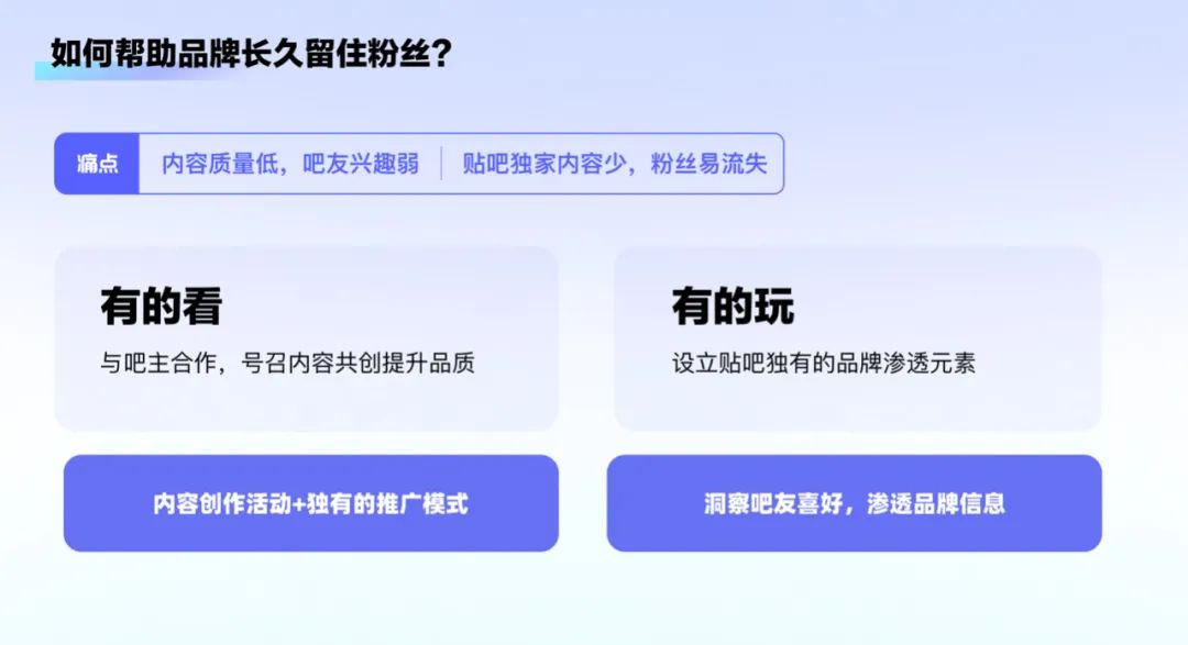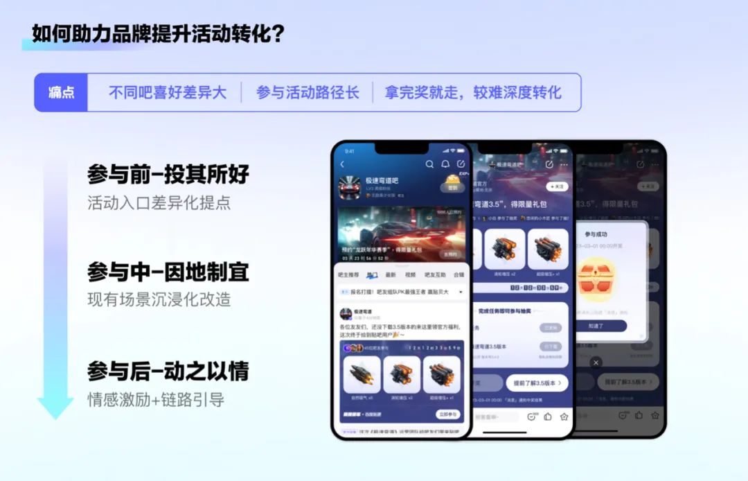 挑战2:如何在满足客户诉求的同时,保证社区互动体验,实现用商一体?我们将客户诉求与用户场景融合,根据过往游戏在贴吧的推广行为中的数据和用户反馈,制定出适合贴吧的游戏商业化设计策略。