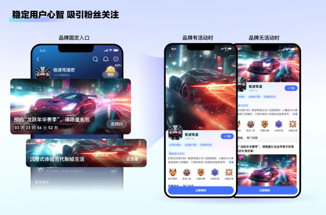 贴吧私域场景下,用户对品牌兴趣较强,更易带动用户关注。因此,我们为品牌制定了可以实时透出动态的品牌窗口,让粉丝群体感知到稳定的品牌阵地。在有品牌活动时,则外露最新动态信息,以活动本身吸引粉丝关注。