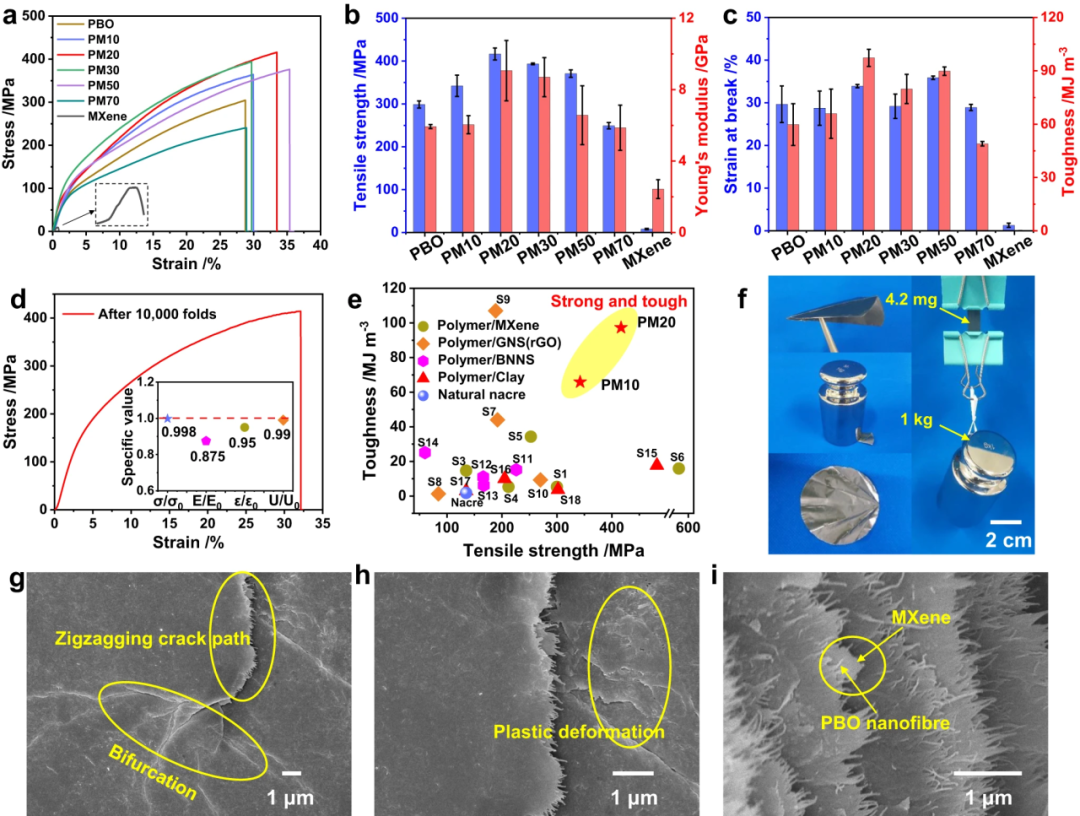 由于PBO纳米纤维网络的增强作用,复合膜的力学性能远远优于纯MXene膜。此外,与纯PBO薄膜相比,在MXene含量为10%时,纳米复合薄膜的力学性能得到有效改善。当MXene含量为20%时,抗拉强度为416.7 MPa,杨氏模量为9.1 GPa,韧性为97.3 MJ m−3,分别是纯PBO薄膜的1.40倍、1.54倍和1.63倍。MXene含量越高,机械性能逐渐降低,PM70甚至比PBO薄膜差。这是因为砖和砂浆结构因MXene的聚集而恶化。
