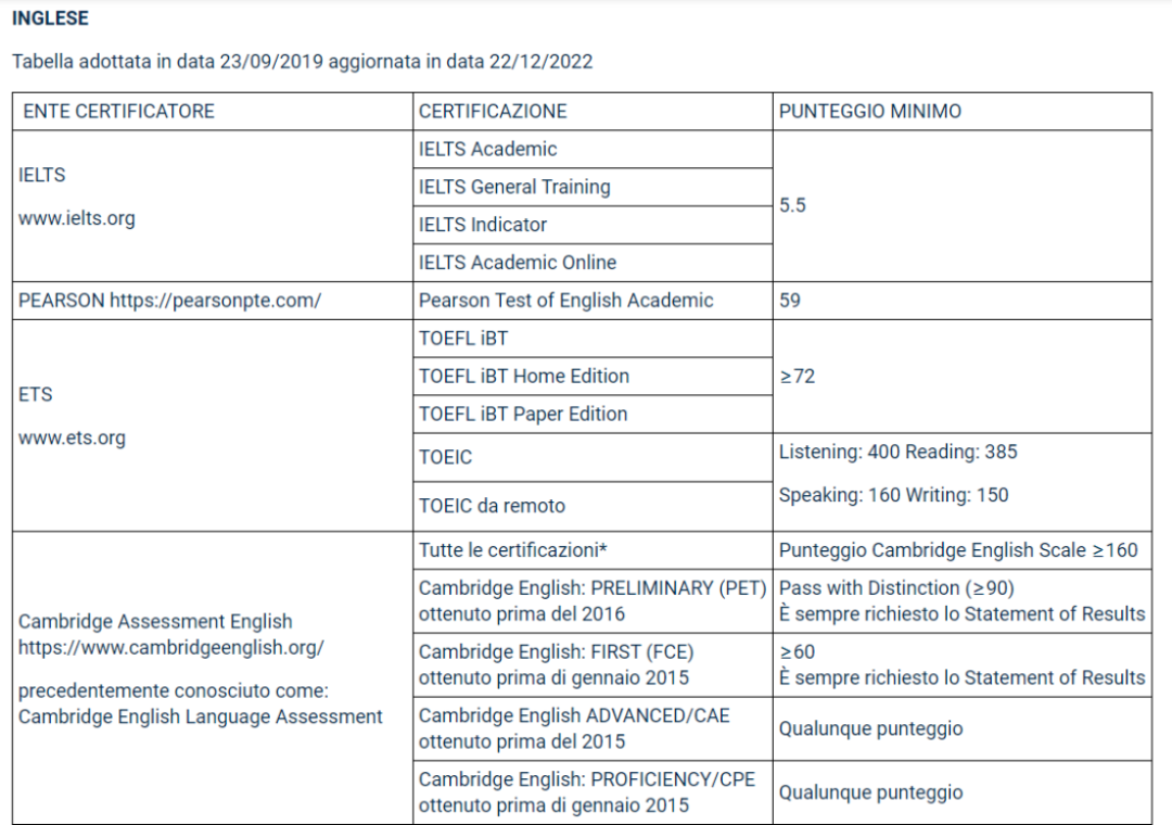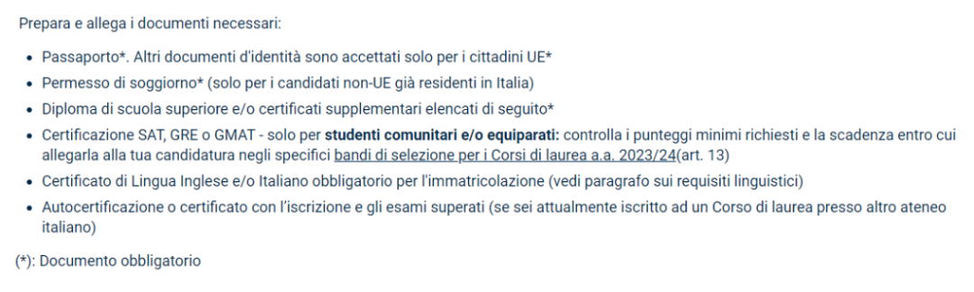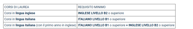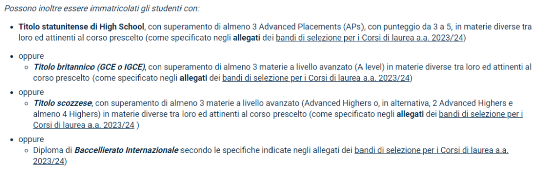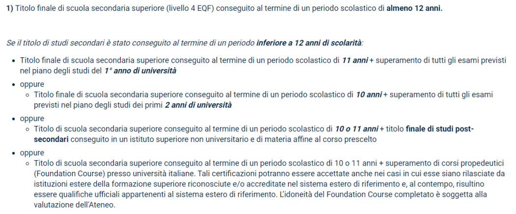 10 年或 11 年学制结束时获得的高中毕业证书 + 成功完成意大利大学的预科课程(基础课程)。如果这些证书由外国高等教育机构颁发,并在外国参考系统中得到承认和/或认证,同时属于外国参考系统的官方资格,则也可被接受。已完成的预科课程的适用性须经大学评估。