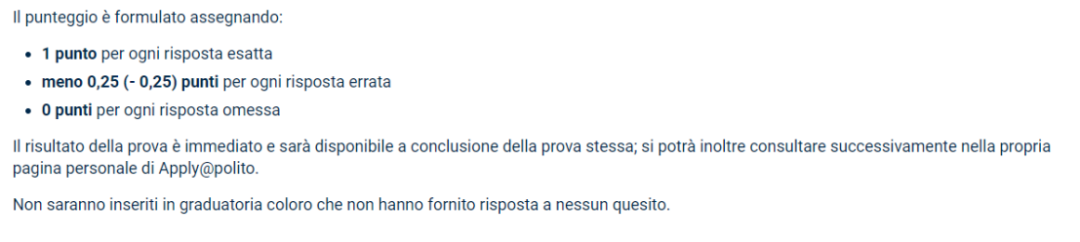 测试结果可在测试结束后立即查询,也可稍后在个人 Apply@polito 网页上查询。列入排名表的最低门槛为 20/100。
