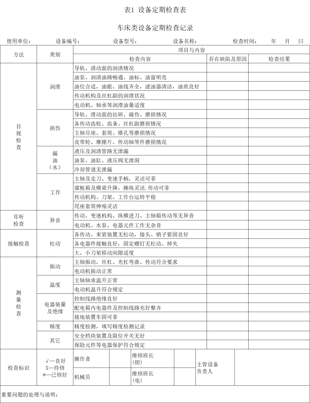 测量检查项目:主轴振动、丝杠和光杠弯曲、传动符合要求;配电箱内电器件及控制线路完好整齐等。定期巡检周期可按照周、旬、月、季、年来执行,参见表1。