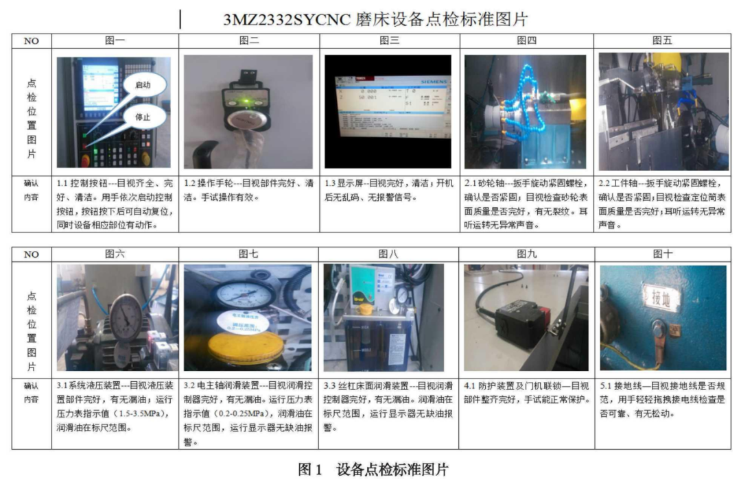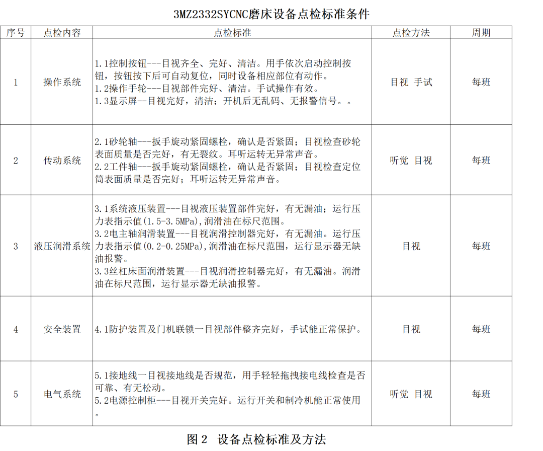 点检五大系统包括操作系统、传动系统、液压润滑系统、安全装置、电气系统。其中操作系统重点以控制按钮、进给操作手轮为主;传动系统以砂轮轴、工件轴、修整器为主;液压润滑系统以润滑油窗、压力表为主;安全装置以砂轮防护罩为主;电气系统以电机、接地线为主。静态点检包括操作系统、安全装置、电气系统;动态点检包括传动系统、液压润滑系统,其中定量点检主要是查验压力表的范围值是否在正常范围内。