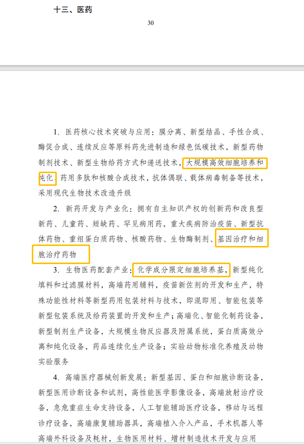 其中在第十三条医药部分,指出要推动医药核心技术突破和应用、新药开发与产业化、生物医药配套产业等。多个领域涉及细胞产业发展,包括鼓励大规模高效细胞培养和纯化,基因治疗和细胞治疗药物,化学成分限定细胞培养基,高端化、智能化制药设备等,有望进一步推动细胞行业发展。