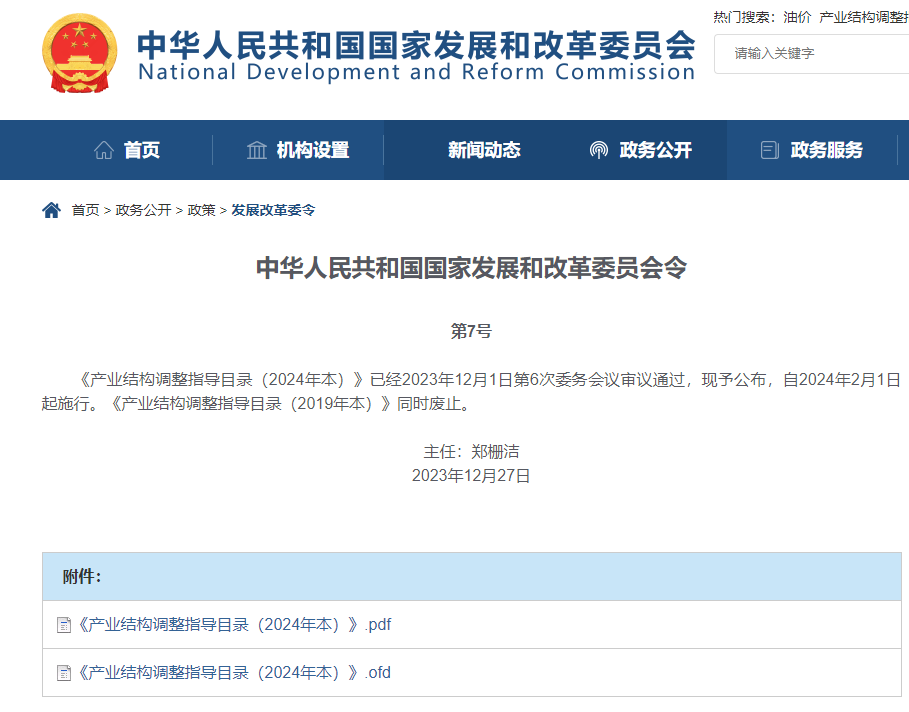 为深入贯彻党的二十大精神,落实中央财经委第一次会议部署,适应产业发展新形势新任务新要求,加快建设现代化产业体系,根据《国务院关于发布实施〈促进产业结构调整暂行规定〉的决定》(国发〔2005〕40号),国家发展改革委牵头会同相关部门共同修订形成《产业结构调整指导目录(2024年本)》,自2024年2月1日起正式施行。