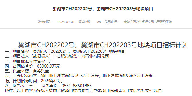 巢湖市CH202202号、巢湖市CH202203号地块项目招标计划