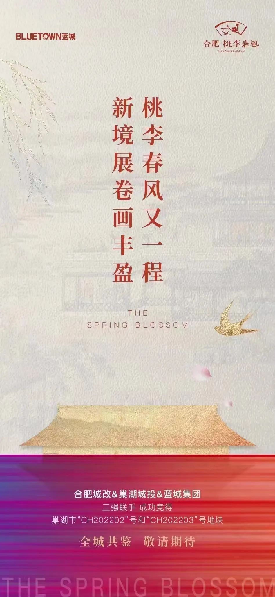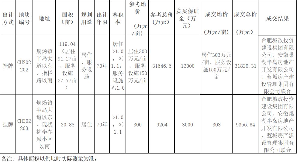 合肥城改+巢湖城投+蓝城集团三强联手成功竞得位于巢湖市烔炀镇半岛大道以东、现状桃李春风小区以南的巢湖市CH202203号地块,单价303万元/亩,总价9356.64万元,住宅楼面价4131.82元/㎡,溢价率1.00%。