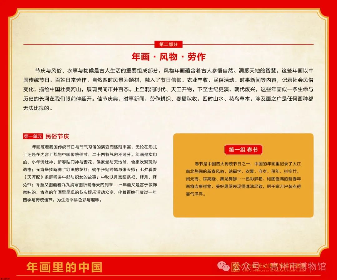 本次展览通过“年画·神祇·人物”、“年画·风物·劳作”、“年画·故事·戏曲”三个部分,呈现了大江南北热闹的新春风俗:贴福字、守岁、拜年、抖空竹、闹元宵、踩高跷、舞龙舞狮……让更多人了解中国春节,感受中国独有的年文化。