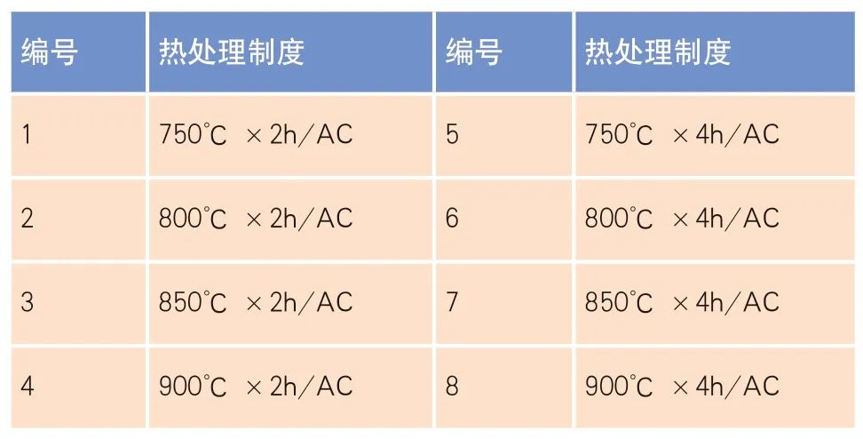 为了进一步研究热处理工艺与组织性能之间的匹配关系,试验采用宝钛集团真空自耗电弧炉经过二次熔炼的φ296mm 小型铸锭在两相区锻造的φ16mm棒材,采用线切割取样,取样部位均为棒材头部中心部位,合金化学成分如表1 所示。在棒材上截取样段进行750 ~900℃不同温度及时间的热处理试验,方案如表2 所示。试验显微组织在Axiovert200 MAT 光学显微镜上观测,室温拉伸性能在Instron5885 电子万能材料试验机上进行,室温冲击韧性在JNS-300摆锤式冲击试验机上进行。