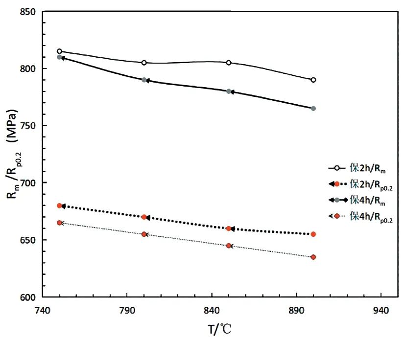 试样整体按表2 所示制度热处理后,室温拉伸力学性能见表3。如图2 所示,TA24 合金的抗拉强度与规定非比例延伸强度随退火温度升高而下降,在保温2h 时,抗拉强度降低了25MPa,规定非比例延伸强度降低了25MPa。在保温4h 时,抗拉强度降低了45MPa,规定非比例延伸强度降低了30MPa。这是由于温度升高导致TA24 合金组织内α 相的尺寸随温度升高而变大,同时还伴有部分α 相的溶解及β 相成分的变化。随着保温时间的延长这种变化会更加明显。晶粒尺寸的增大让合金的力学性能降低,且合金处在较长的保温时间下组织内次生α 相已经充分析出并长大,温度越高,次生α 相粗化程度越大。