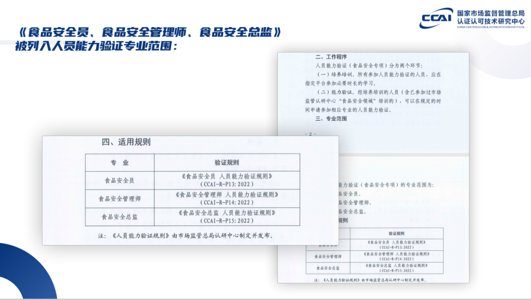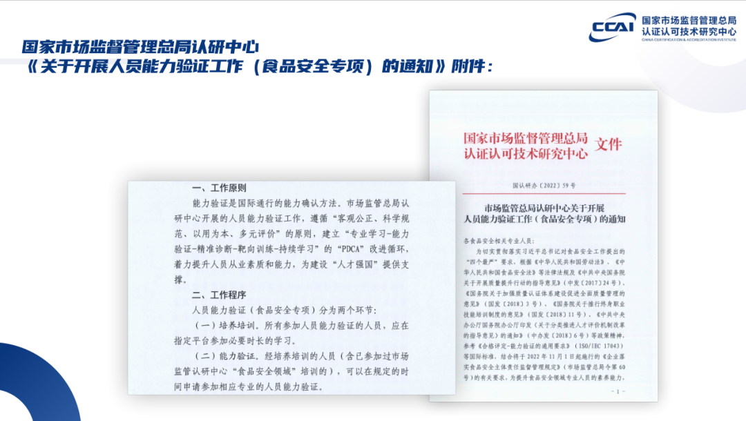 针对上述职业需求,国家市场监督管理总局认研中心推出了食品安全总监人员能力验证证书,以评估并证明职业人员在食品安全管理领域的专业和实践能力。该证书体现的是国家在食品安全领域的执法和管理标准,持有该证书将会为职业人员在行业内不断发展提供更多的机会。食品安全总监人员能力验证证书设立至今,已经成为食品安全行业公认的高质量证书之一,越来越多的从事食品安全工作的人员开始关注和申请。