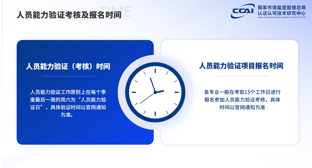 各专业一般在考前15个工作日进行报名参加人员能力验证考核,具体时间以官网通知为准。原则上在每个季度(3、6、9、12月)最后一周的周六考试 ,具体验证时间以官网通知为准。