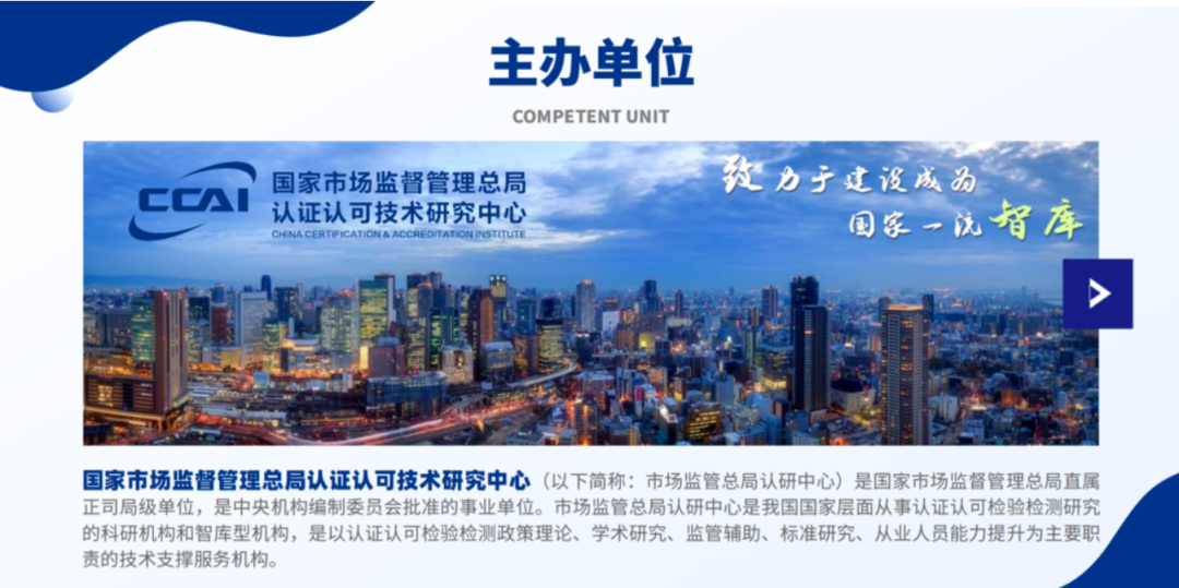 1、国家市场监督管理总局认证认可技术研究中心是国家市场监督管理总局直属正司级事业单位, 具备着从业人员能力提升、监管辅助和认证认可的相关职责。