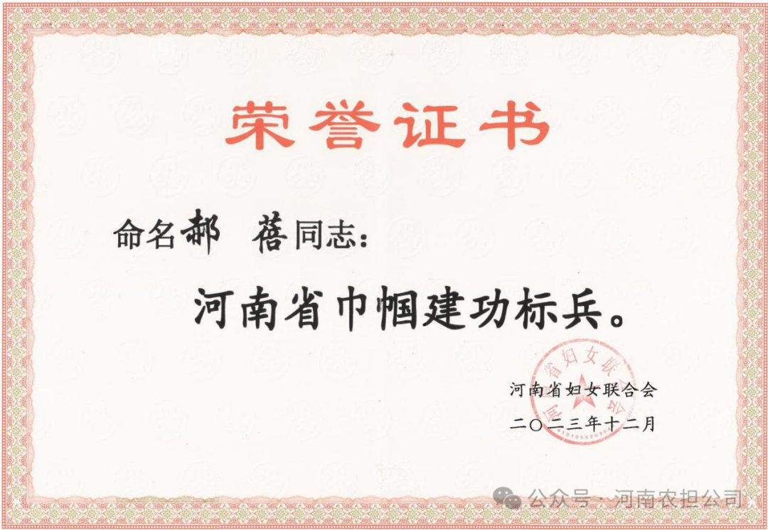 近日河南省妇联印发《关于命名河南省巾帼文明岗 河南省巾帼建功标兵的决定》,授予我省100人为河南省巾帼建功标兵称号,其中,河南农担公司大数据风控中心总监郝蓓光荣上榜。