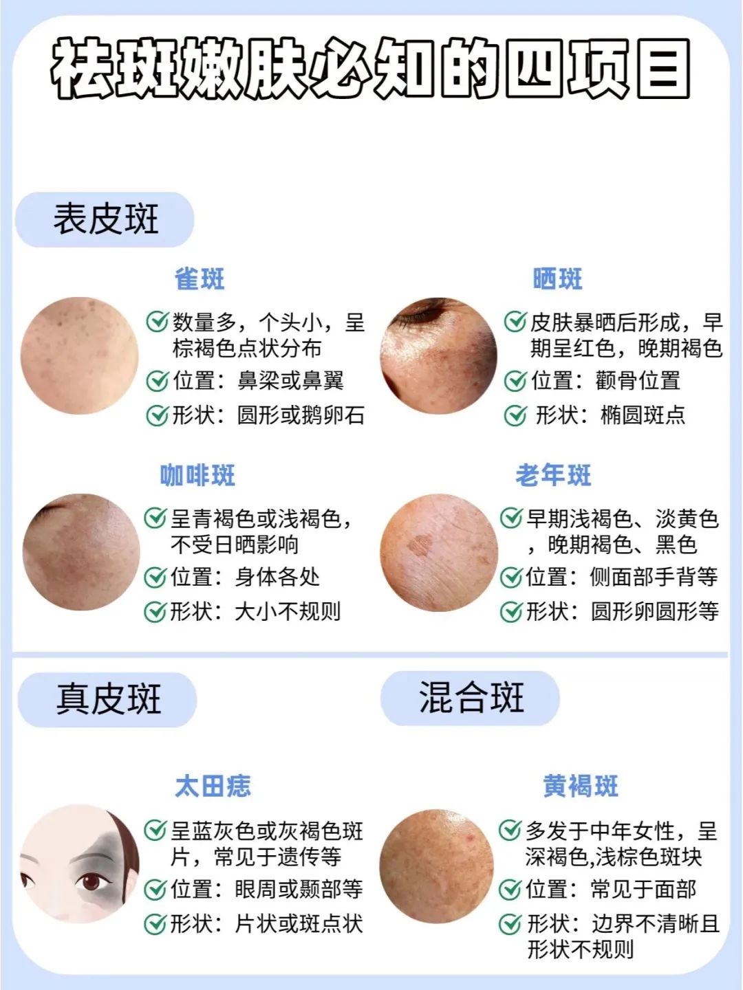面部常见的色斑主要是雀斑、晒斑和黄褐斑,它们可能单独出现,也可能混合出现: