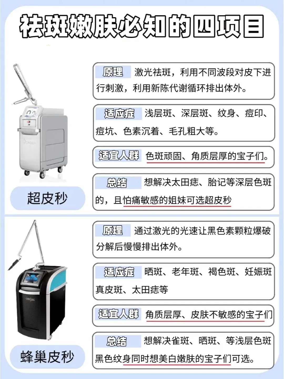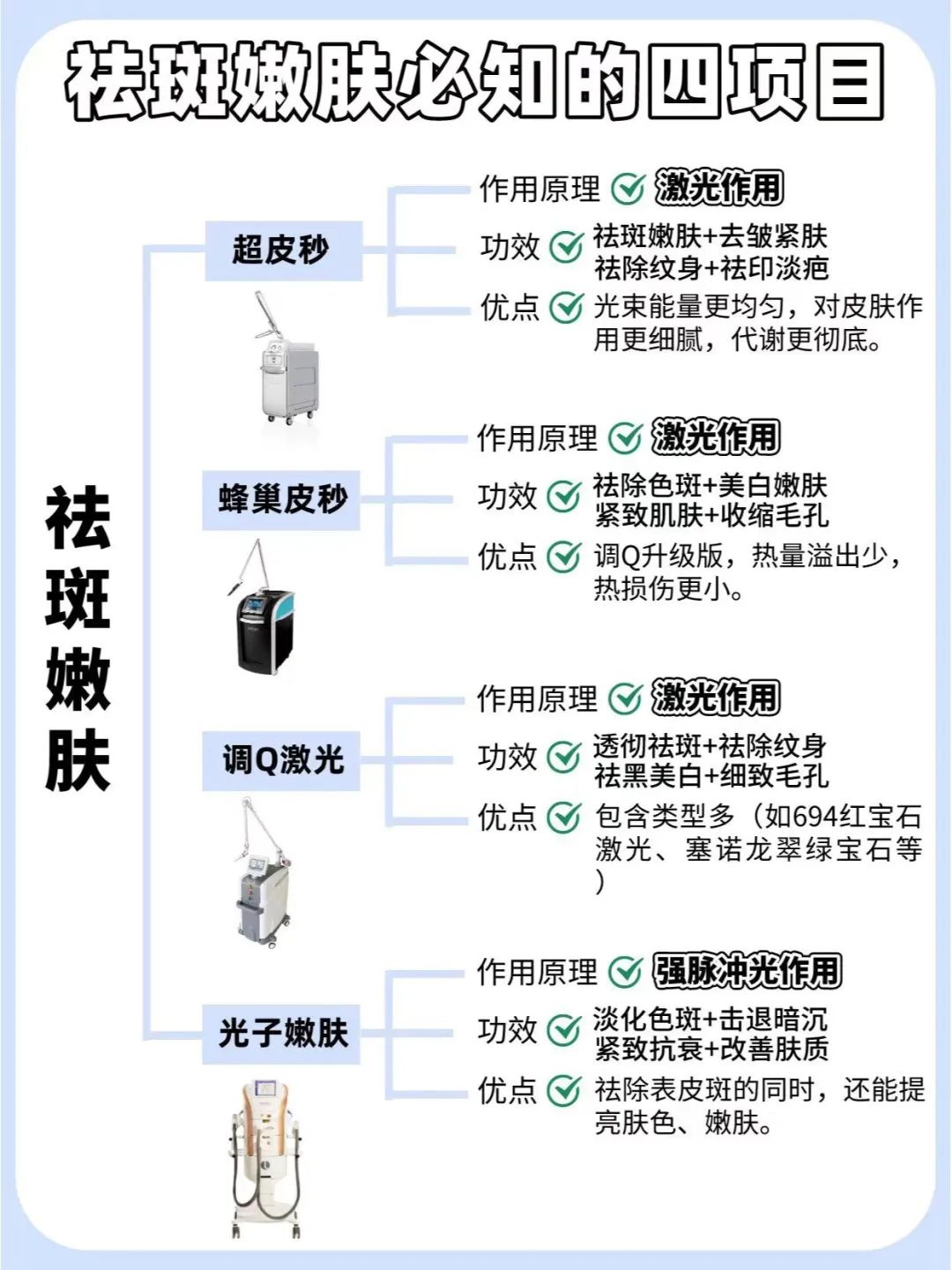 斑点一旦形成到表皮,涂抹式的面霜基本就没用了~在医美上,常见的祛斑光电仪器有超皮秒、蜂巢皮秒、调Q激光、光子嫩肤。