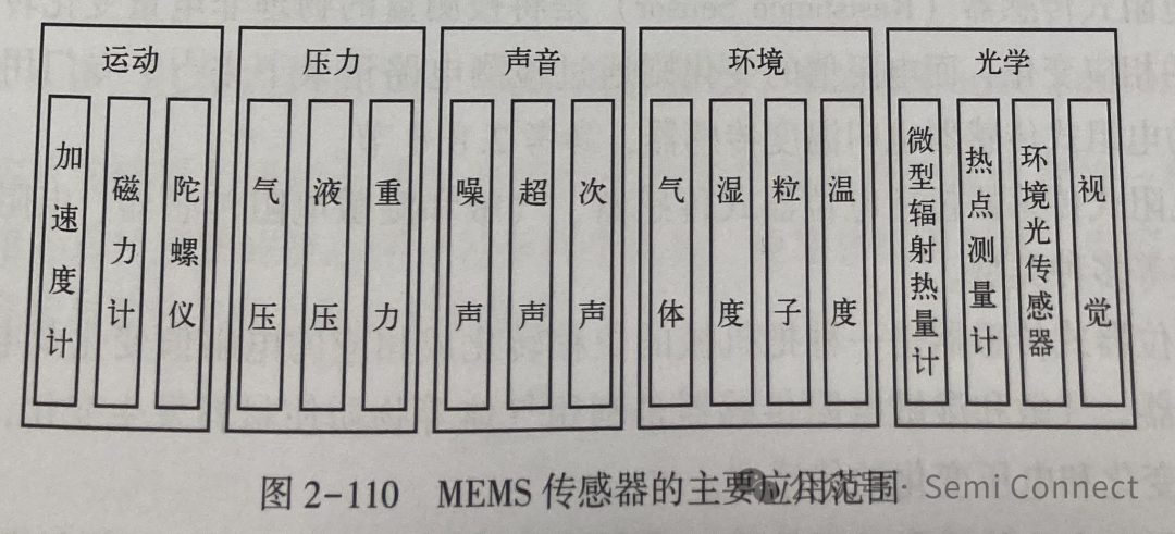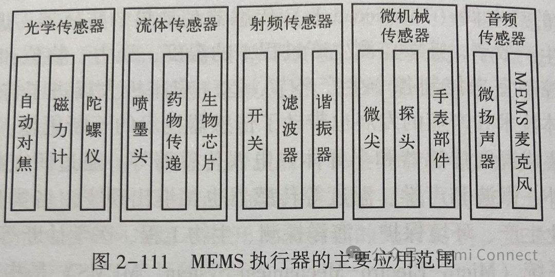 相比传统器件,微机电系统及器件具有微型化、高集成度和易于大批量生产等特点。常见的 MEMS 器件包括硅麦克风、加速度计、陀螺仪、磁传感器、体声波 (Bulk Acoustic Wave, BAW 滤波器)、压力传感器、指纹传感器、距离传感器,环境光传感器等。每个 MEMS 器件都是一个独立的小系统。MEMS 传感器主要应用范围如图2-110所示。MEMS 执行器的主要应用范围如图 2-111 所示。