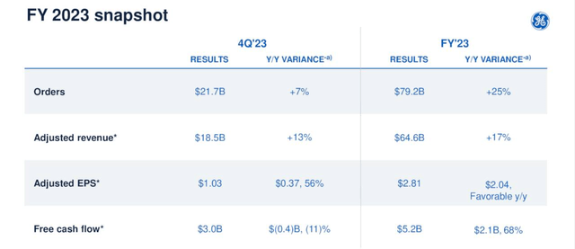 从下图可以看出,该公司的营收和利润均实现强劲增长。第四季度调整后总收入达到185亿美元,同比增长13%。2023财年,总收入增长17%。在自由现金流方面,增长更为可观。2023财年,通用电气的营收总额为52亿美元,同比增长68%。