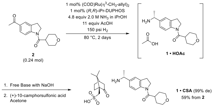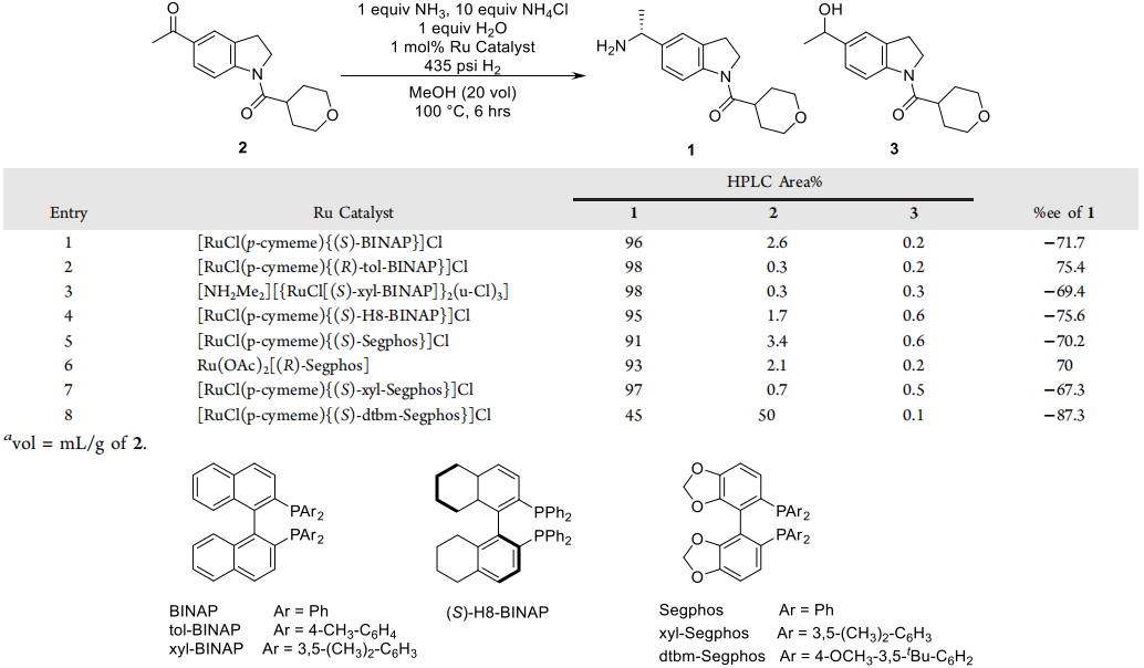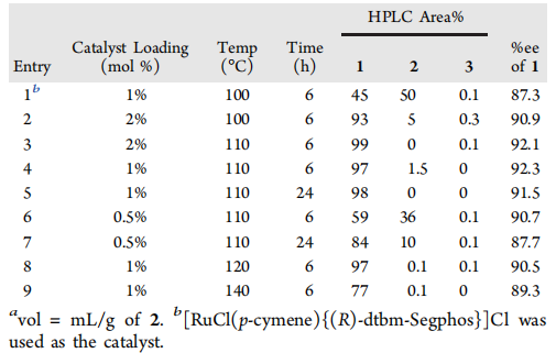 条件下,反应在110°C下的54 h内实现了完全转化,ee 93.5%,酮还原杂质<0.3%。更高的压力可以实现更快的转化,但设备的限制压力需要<250 psi。