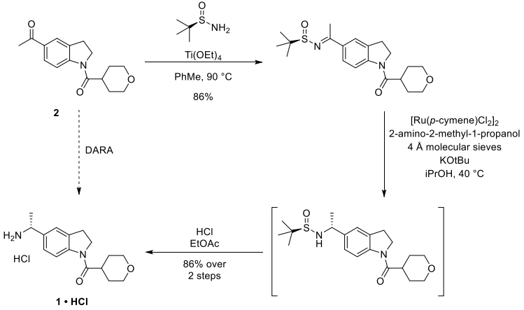 随后在Ru催化剂转移加氢的条件下还原,虽然该工艺有效地提供了所需中间体,收率73%,97.9% ee,但整个过程很繁琐,需要过量的钛并过滤去除钛废物,对映体诱导的手性辅基以及脱保护步骤。