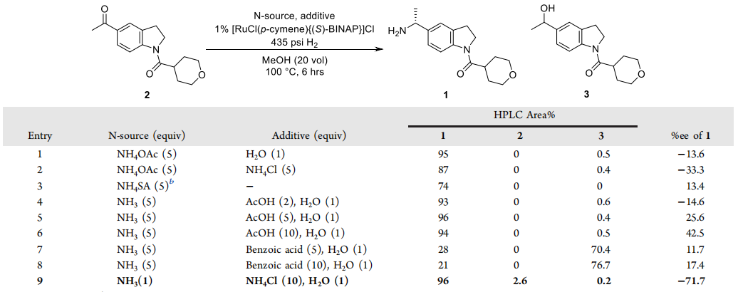 OAc、水杨酸铵或氨联合其他羧酸添加剂的BINAP Ru催化剂进行广泛筛选,并没有找到合适的替代品。使用[RuCl(p-cymene){(S)-BINAP}]Cl与氨、氯化铵、H