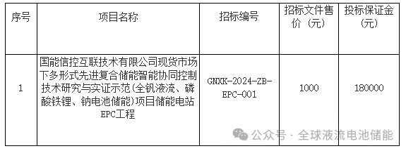 本招标项目名称为:国能信控互联技术有限公司现货市场下多形式先进复合储能智能协同控制技术研究与实证示范(全钒液流、磷酸铁锂、钠电池储能)项目储能电站EPC工程,项目招标编号为:GNXK-2024-ZB-EPC-001,招标人为国能信控互联技术有限公司,资金来源为企业自筹。招标代理机构为国能龙源蓝天节能技术有限公司。本项目已具备招标条件,现对该项目进行公开招标。