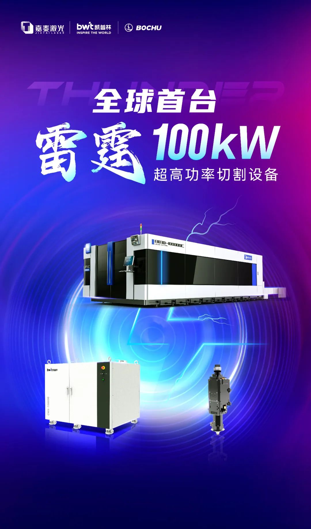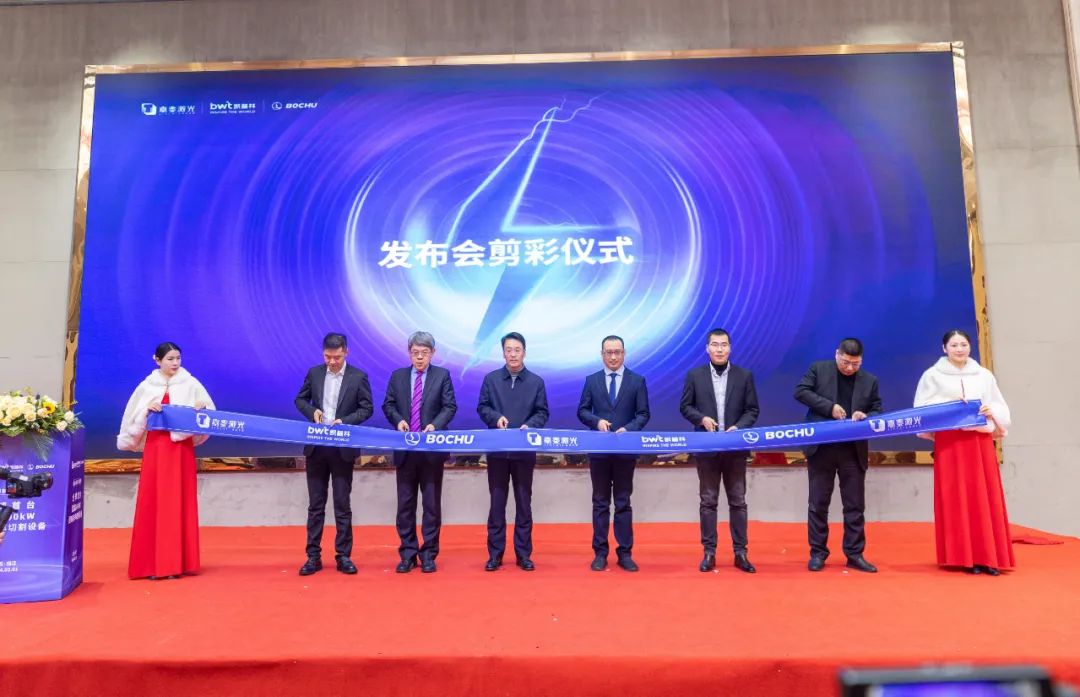 宿城区领导秦永辉致辞在合作剪彩仪式上,宿城区领导秦永辉,北京工业大学教授王璞、嘉泰激光总经理郑长和、嘉泰激光研发副总陈大建、嘉泰激光物控副总汤孙槐、凯普林光纤事业部轮值总经理赵巨云共同上台,宣告雷霆100kW超高功率切割设备正式发布。当天下午,与会领导和嘉宾还分别参观了嘉泰激光和凯普林(宿迁)分公司。两家公司见证了宿迁激光装备产业从0到1、由弱到强,逐步发展成为全国有影响的新兴产业的“裂变”过程。嘉泰激光携手凯普林、柏楚电子联合发布全球首台雷霆100kW超高功率切割设备,是中国激光技术飞速进步的重要标志之一,也是激光科技推动制造业催生新质生产力的阶段性成果。行业人士认为,面对中国工业制造全面转型的大趋势,功率高达100kW产品的出现堪称“及时雨”,它有效打碎了人们对超高功率激光设备必要性的质疑。在厚板领域,雷霆100kW产品不仅实现对上一代产品的效率倍增,强化在超厚板领域的加工优势,更是打通超厚板加工壁垒,让切割能力真正实现“质变”,尤其是实现在超厚板领域对等离子/火焰等产品的全面取代。