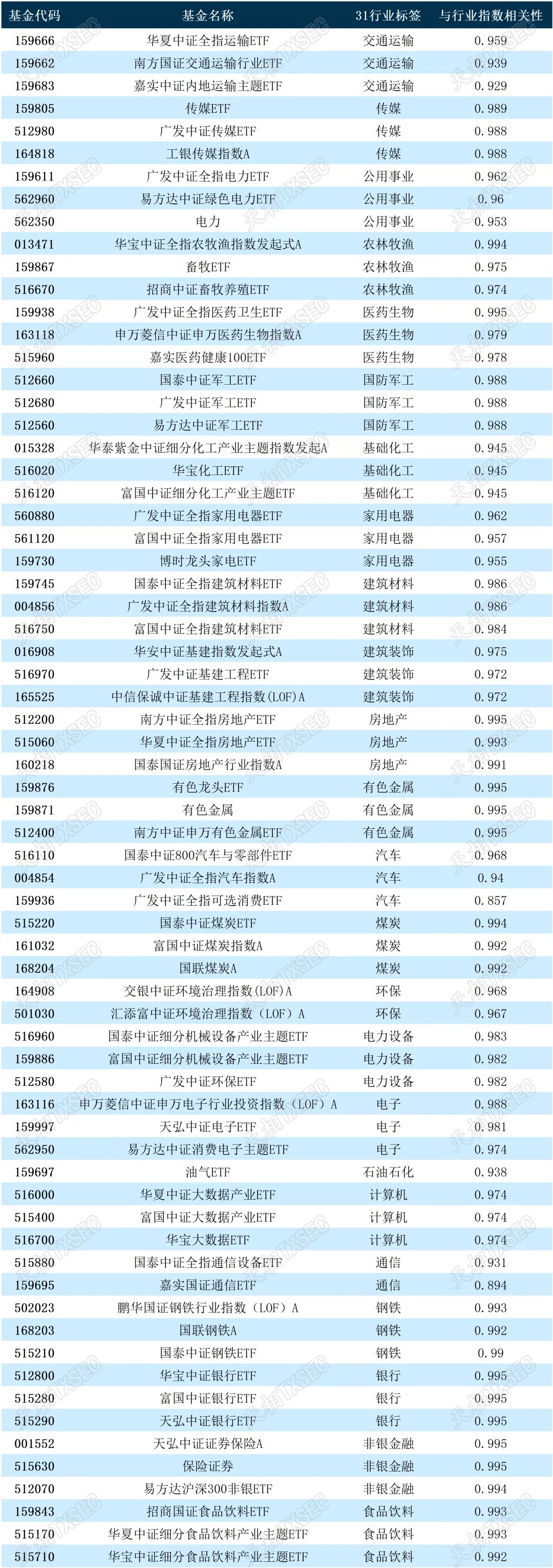 (3)收益相关性匹配:计算申万一级行业指数与行业基金净值日度收益率的相关性(近一年),保留相关性在0.7以上的基金。