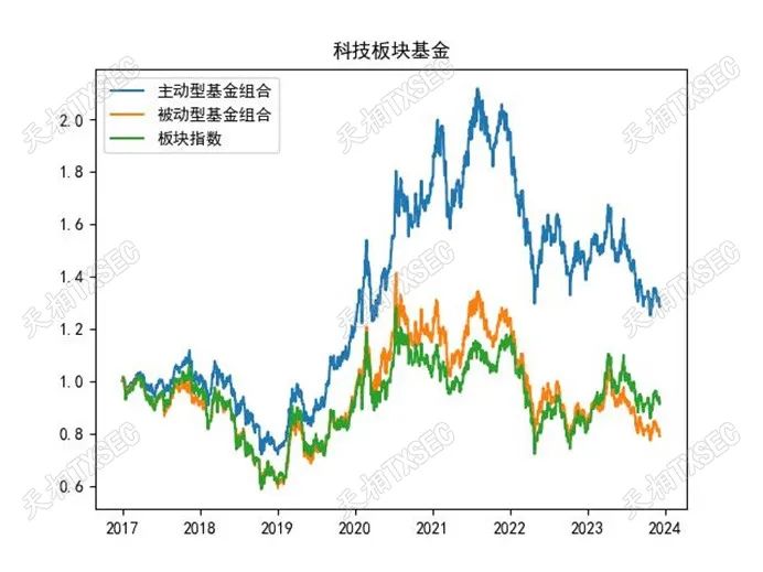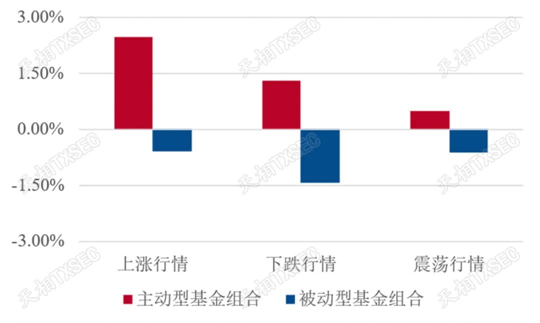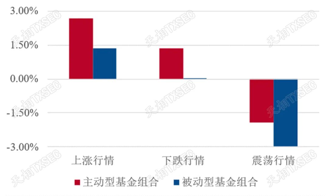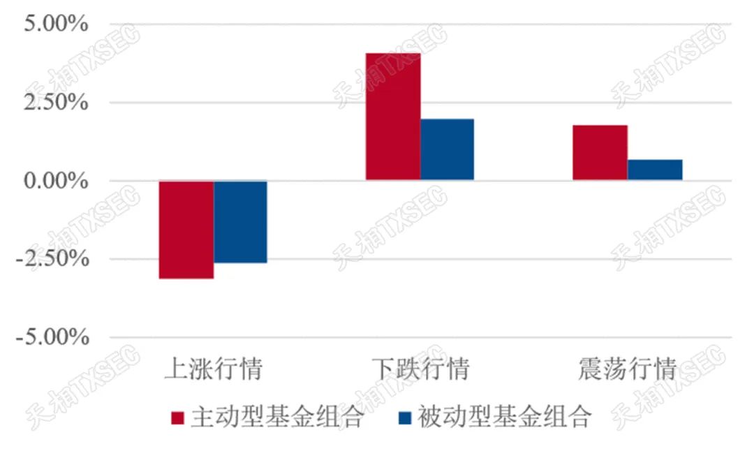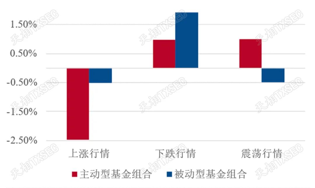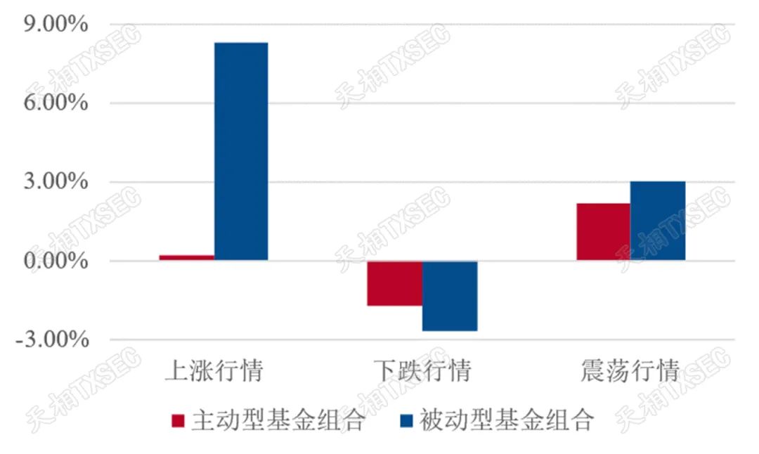 综合来看,科技、制造、医药、周期板块的被动指数基金与板块指数走势接近,主动型基金则能够做出更突出的长期超额收益。其中,医药、制造板块的主动型基金在上涨、下跌、震荡行情下均能战胜被动型基金,而科技板块则凭借更强的抗跌性和收益稳健性,在长期获得了尤为突出的超额收益。此外,消费板块或由于受到食品饮料等公司龙头效应影响,被动型基金长期收益明显占优;而金融板块主动型基金与被动型基金的表现则与行业指数差异较小,被动型基金或更具配置优势。
