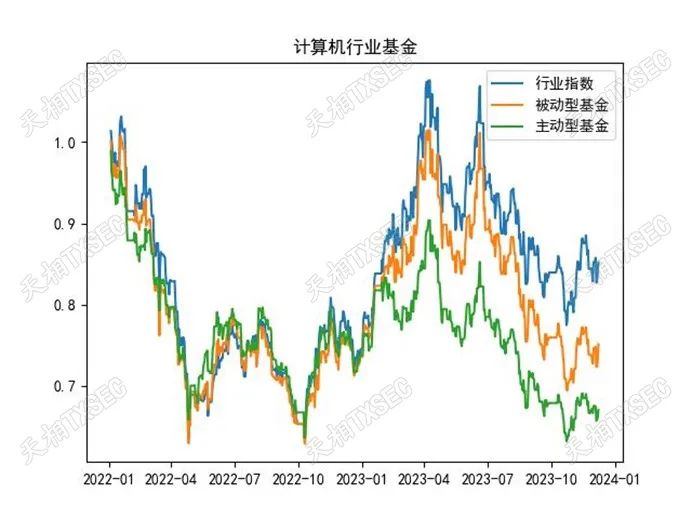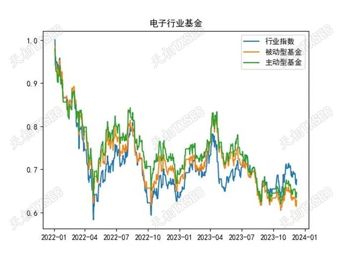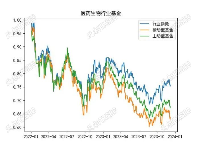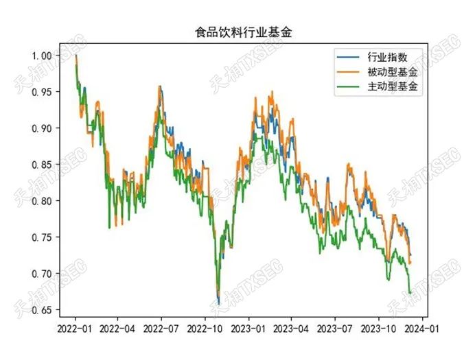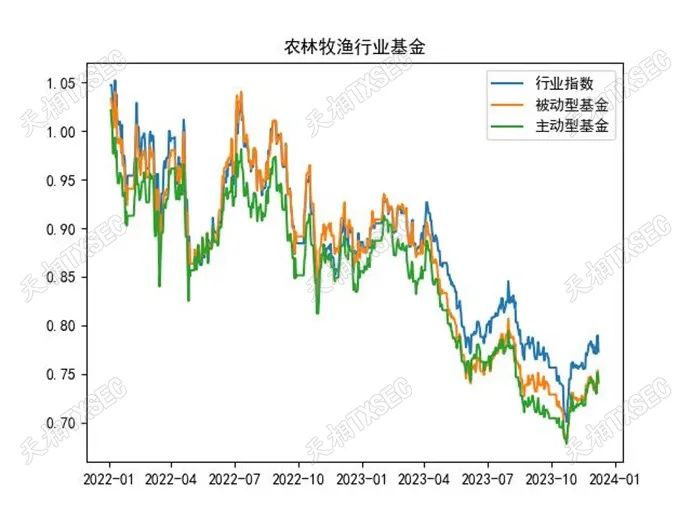 我们对上述行业属性的主被动型基金进行了规模加权处理,并将拟合指数与申万一级行业股票指数进行了比对。由于部分行业基金成立时间较晚,因此我们仅考察2020-12-31至2023-12-31区间内的基金与行业指数表现。由于申万一级行业较多,下图仅展示了具有代表性且关注度相对较高的行业标签基金。