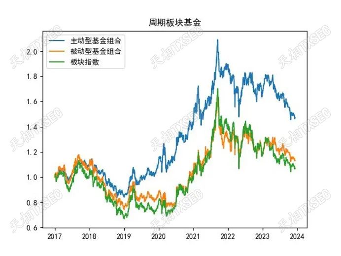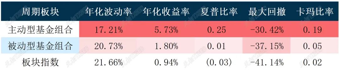 周期板块虽然整体收益不高,但风险相对也较低。从长期净值表现来看,被动型基金与板块指数相关性紧密,而主动型基金则做出了相对明显的超额收益,或体现出行业内部权益资产质地分化,主动型基金经理更有可能通过择时选股获取行业超额alpha。