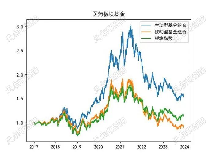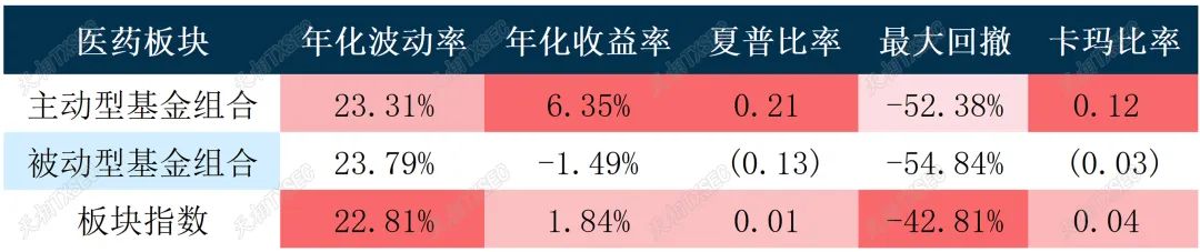 医药板块的样本基金数254只,其中被动型基金数量78只。医药板块整体取得了1.84%的年化收益率,主动型基金则做到了6.35%的年化收益率。从长期净值表现来看,被动型基金与板块指数相关性紧密,而主动型基金则做出了相对明显的长期超额收益。
