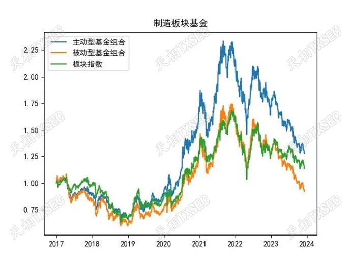 分阶段行情来看,我们统计了上涨、震荡、下跌区间主被动型基金相比板块指数的超额收益(下文同,不再赘述)。在上涨行情时,制造板块主动型基金捕获收益的能力强于被动型基金和板块指数,下跌行情下,主动型基金也有着更强的抗跌能力,更好地守住了以往收益。在震荡行情中,制造板块的主动型基金收益优于被动型基金但劣后与板块指数。综合来看,制造板块主动型基金长期配置价值较高,且具有短期博取阶段性行情的能力,整体具有较强的配置价值。