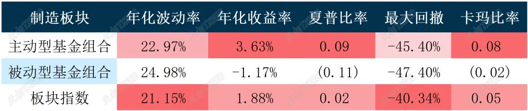 制造板块的样本基金数量最多,主/被动型基金均超过百余个样本。从长期业绩来看,制造板块的被动型基金走势与板块指数相近,而主动型基金长期则获得了较明显的超额收益。从风险收益指标的长期表现来看,主动型基金表现均优于板块指数和被动型基金。制造板块主动型基金年化收益率为3.63%,强于板块指数的1.88%和被动型基金的-1.17%。在风险控制方面,制造板块主动型基金的年化波动率22.97%,略高于板块指数但较被动型基金更低。