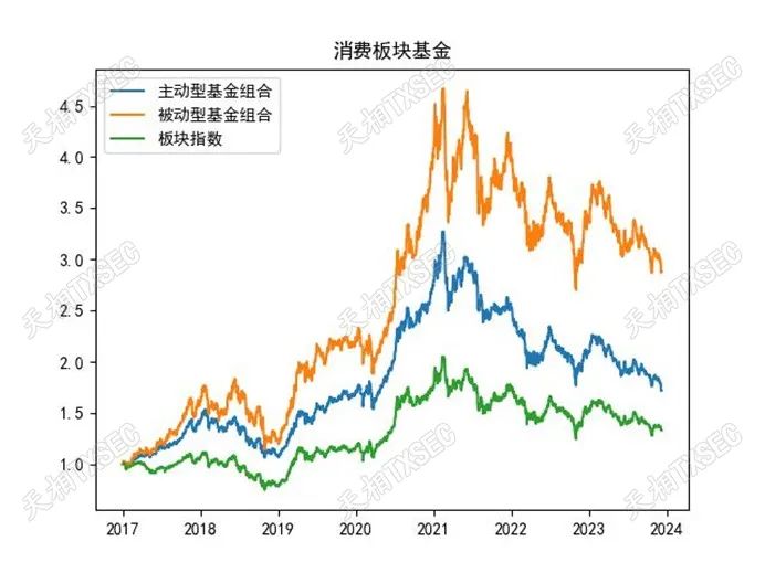 消费板块在过去7年间取得了较高的收益回报,板块指数年化收益4.24%,主动型基金平均年化收益8.12%,被动型基金平均年化收益则达到了16.49%。从长期走势来看,消费板块中被动型基金表现尤为突出,优于主动型基金,主动型基金则优于消费板块指数。