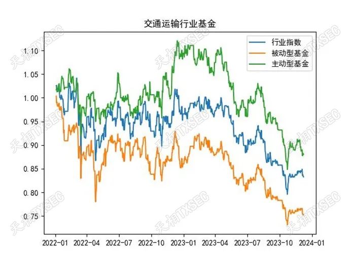 值得注意的是,交通运输行业的主动型基金是稀缺的例外,其表现较为突出,近两年比较显著的跑赢了指数。这或许是部分交通运输行业的标的资产质地相对分化有关。