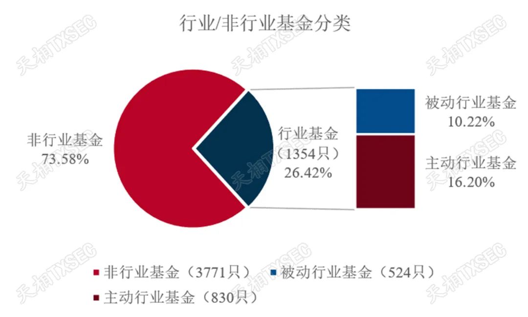 如图表 25所示,基础基金池内的5125只基金被划分为3771只非行业基金和1354只行业基金,其中,被动行业基金524只,主动行业基金830只,占比分别为38.7%和61.3%。