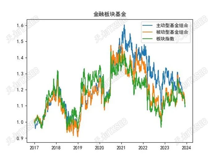 金融板块样本基金数量124只,其中被动型基金数量85只,多于该板块的主动型基金。从长期业绩净值表现来看,主动型基金、被动型基金和板块指数之间的表现区别并不明显,相关性较高。在2021-2023年中旬阶段,主动型基金能够阶段性取得部分超额收益,但此后未能明显持续。