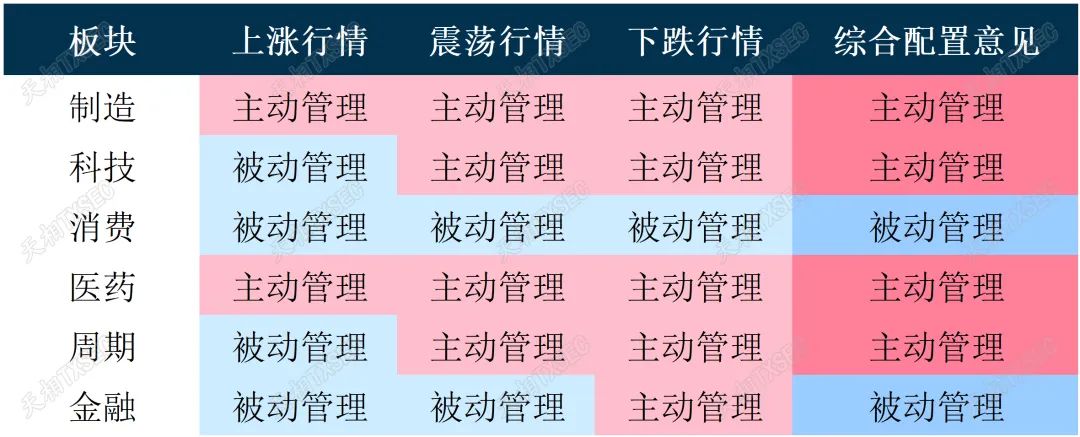 在板块配置方面,我们认为制造、科技、医药、周期的主动型基金或具有长期配置价值,金融板块被动型基金长期表现则相对更优,对于消费板块则需要细分来看,关注到龙头效应对行业表现的影响。