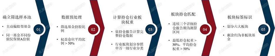 由于六大板块内涵盖了多个行业,因此指数收益率匹配法适用性一般。我们直接采用基于基金持仓的匹配法进行基金板块划分。具体方法如下所示: