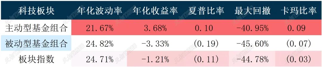 分阶段行情来看,科技板块的主动型基金表现出了更强的稳定性。上涨行情期间,科技板块的主动型基金季度平均涨幅虽落后于被动型基金以及板块指数,但当市场处于下跌行情,主动型基金季度则明显较被动型基金更具优势。且在震荡行情期间,科技板块主动型基金的超额收益也非常明显,每季度收益平均超过板块指数3.59%,或体现出科技板块基金在震荡行情下较强的alpha捕获能力。综合来看,科技板块主动型基金长期配置价值较高。
