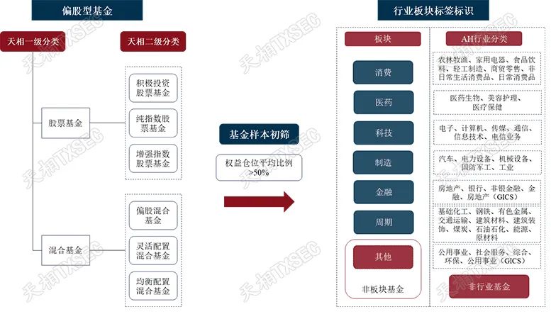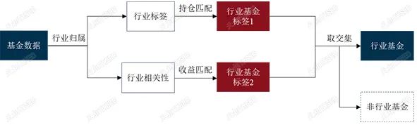 随后,我们尝试采用持仓匹配法和收益匹配法进行板块/行业标签划分,无法划分标签属性的则归为非板块/行业基金。具体流程及分类如下图所示。