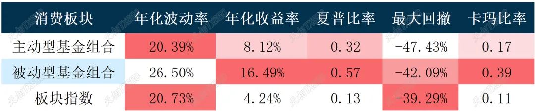 分行情来看,虽然在下跌行情中,消费板块的被动型基金较板块指数平均季度收益低2.68%,但当处于上涨行情和震荡行情时,其平均季度收益会高于板块指数8.33%和3.03%,消费板块被动型基金体现出较高的收益弹性。