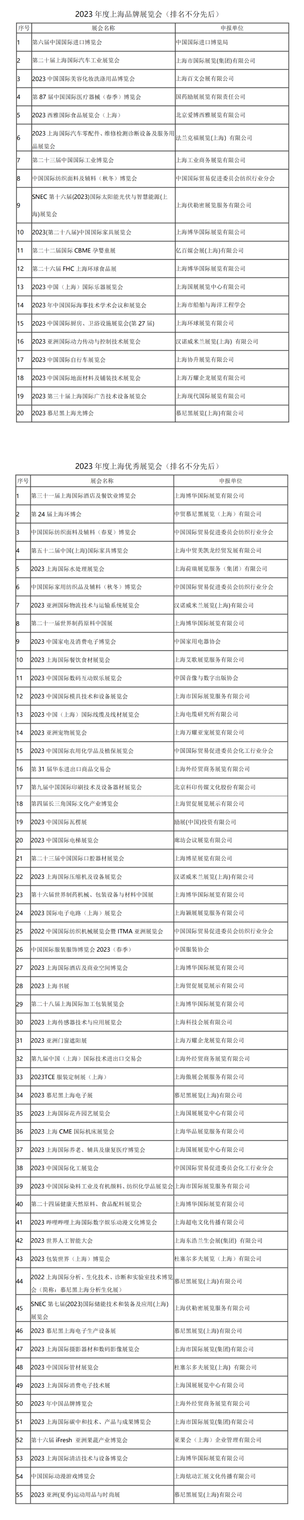 近日,为进一步贯彻落实《上海市推动会展经济高质量发展,打造国际会展之都三年行动方案(2023-2025年)》,上海市会展行业协会向全行业发布“2023年度上海品牌展览会、优秀展览会”评优活动 ,并于1月31日对获得“2023年度上海品牌展览会”称号的20个项目、获得“2023年度上海优秀展览会”称号的55个项目正式予以公布。
