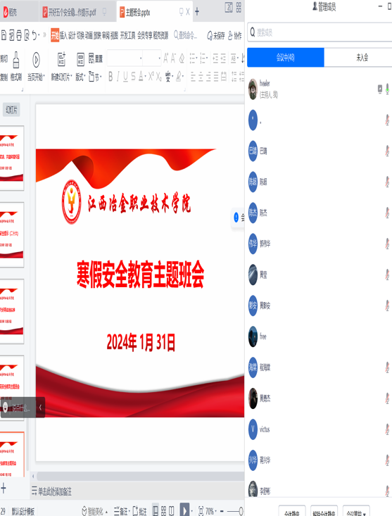 2024年1月29日至31日,为落实《开好五个安全稳定工作专题会议的工作提示》文件精神,打通学生安全教育“最后一公里”,电气工程学院辅导员、班主任采取线上形式组织本班学生召开寒假春节期间安全教育主题班会。