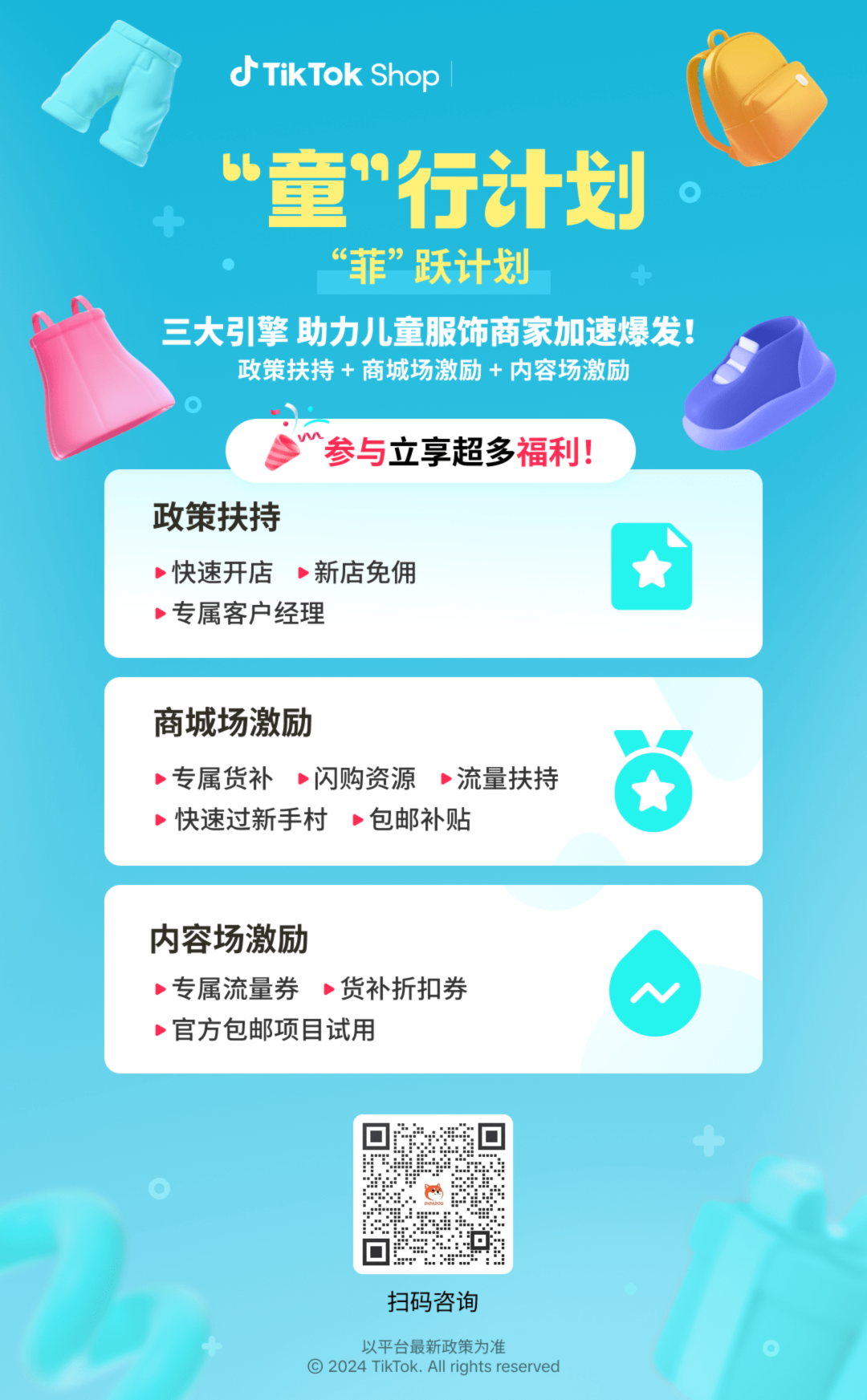 TiKTok Shop官方现推出“童”行计划,助力儿童服饰商家加速爆发,商家可以享受快速开店,新店免佣,专属客户经理等政策扶持,专属流量券,闪购资源,包邮补贴,流量扶持等多项福利。