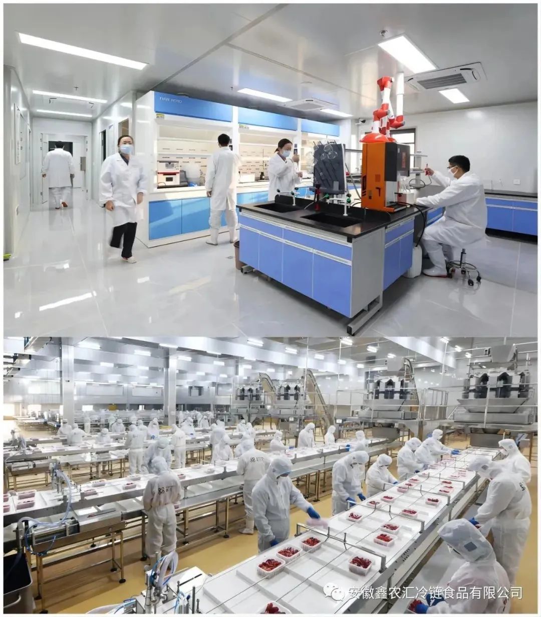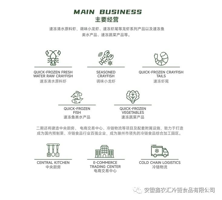 鑫农汇公司现位于全椒县十字镇界首工业园内,项目总占地220亩,一期投资2.2亿元,2022年5月开始投入运营。主营业务包括冷链食品加工、食用农产品收购、水产品生产、加工、销售等业务;目标是打造以速冻清水原料虾、调味小龙虾、速冻虾尾、虾壳粉等龙虾系列产品加工为主,速冻鱼类水产品、速冻蔬菜加工为辅的冷链食品加工综合物流园区,成立国内冷链生鲜百强企业。